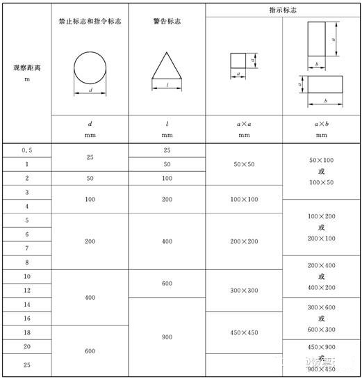 在良好觀察條件下,安全標(biāo)志的最小推薦尺寸及對(duì)應(yīng)的觀察距離見(jiàn)下表,當(dāng)觀察條件不適合但又需要標(biāo)志時(shí),則相應(yīng)增大標(biāo)志的尺寸。