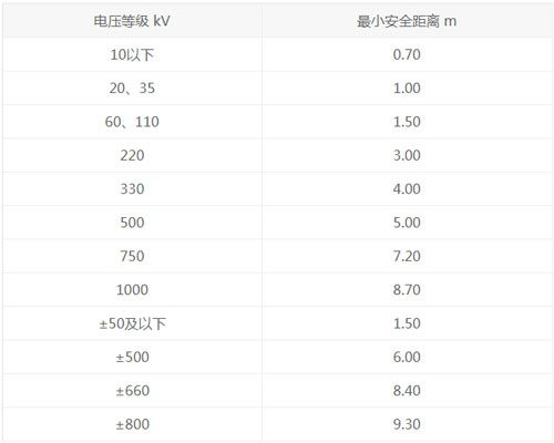 一般人會誤認(rèn)為,只要自己不碰著高壓線,就不會發(fā)生觸電。實際情況是,人即使不碰著高壓線,在一定距離以內(nèi),也會有危險。在電壓差足夠大的時候,空氣都可能被電擊穿。當(dāng)然,空氣距離越大,越不容易被擊穿,足夠的空氣距離能夠?qū)崿F(xiàn)絕緣。為了防止人體觸及或接近帶電體,防止車輛或其他物體碰撞或接近帶電體造成危險,人體需要與帶電體保持一定的距離,這個距離稱為安全距離。我國《電力安全工作規(guī)程》給出了人員與通電高壓交流線路的安全距離,見下表。