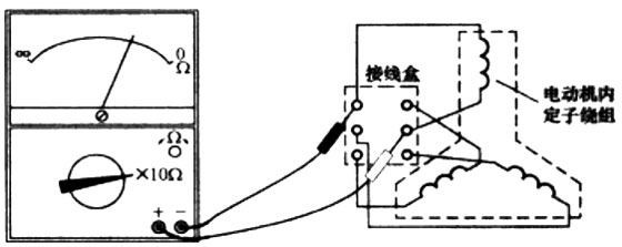 電動機(jī)內(nèi)部有三相繞組,每相繞組有兩個接線端子,判斷各相繞組的接線端子可適用萬用表歐姆檔。將萬用表置于R×10Ω檔,測量電動機(jī)接線盒中任意兩個端子的電阻,如果電阻很小,如圖1所示,表明當(dāng)前所測的兩個端子為某相繞組的端子,再用同樣的方法找出其他兩相繞組的端子,由于各相繞組結(jié)構(gòu)相同,故已將其中某一組端子標(biāo)記為U相,其它兩組端子則分別標(biāo)記為V、W相。