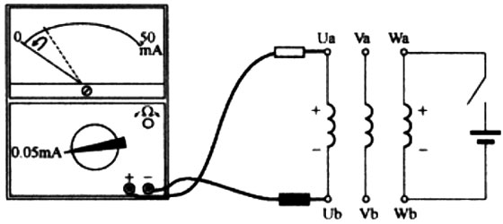 直流法判斷繞組同名端的原理是:當(dāng)閉合開關(guān)的瞬間,W繞組因突然有電流通過而產(chǎn)生電動勢,電動勢極性為Wa正、Wb負(fù),由于其它兩相繞組與W相繞組相距很近,W相繞組上的電動勢會感應(yīng)到這兩相繞組上,如果Ua端與Wa端為同名端,則Ua端的極性也為正,U相繞組與萬用表接成回路,U相繞組的感應(yīng)電動勢產(chǎn)生的電流從紅表筆流入萬用表,表針會往右擺動,開關(guān)閉合一段時間后,流入W相繞組的電流基本穩(wěn)定,W相繞組無電動勢產(chǎn)生,其他兩相繞組也無感應(yīng)電動勢,萬用表表針會停在0刻度處不動。