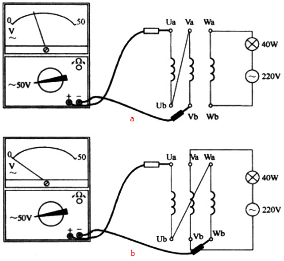 交流法判別繞組首尾如圖3a所示,先講兩相繞組的兩個端子連接起來,萬用表置于交流電壓檔,紅、黑表筆分別接此兩相繞組的另兩個端子,然后給余下的一相繞組接燈泡和220V交流電源,如果表針有電壓指示,表明紅、黑表筆接的兩個端子為異名端(兩個連接起來的端子也為同名端),再更換繞組做上述測試,如圖3b所示,圖中萬用表指示電壓值為0,表明UbWa為同名端(UaWb為同名端)。找出各相繞組的同名端后,將性質(zhì)相同的三個同名端作為各繞組的首端,余下的三個端子則為各繞組的尾端。