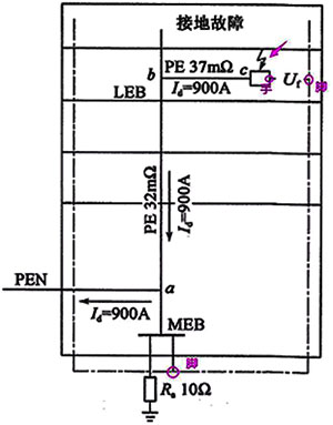 可知c和LEB之間只有一個(gè)PE支線電阻37mΩ,根據(jù)歐姆定律c-LEB之間電位差為900×37/1000=33.3V<50V安全電壓。