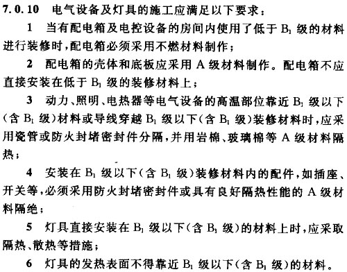 1.19 《電氣驗(yàn)收規(guī)范》中第10.2.5.2條關(guān)于母線槽安裝的防火封堵有要求,第18.2.2.3條對(duì)容量100W及以上的燈具,要求其“引入線應(yīng)采用瓷管、礦棉等不燃材料作隔熱保護(hù)”,這個(gè)隔熱保護(hù)也是重要的防火保護(hù)措施之一,這個(gè)要求的內(nèi)容應(yīng)是來(lái)源于改版前的《建筑設(shè)計(jì)防火規(guī)范》第10.2.4條及《建筑電氣照明裝置施工與驗(yàn)收規(guī)范》 (GB 50617-2010)中第4.1.4條,區(qū)別在于:《建筑設(shè)計(jì)防火規(guī)范》及《建筑電氣照明裝置施工與驗(yàn)收規(guī)范》只針對(duì)鹵鎢燈和白熾燈泡,但《電氣驗(yàn)收規(guī)范》則針對(duì)所有的光源,只要功率超100W即要求采用該防火保護(hù)措施,除非是敞開式燈具。個(gè)人認(rèn)為本條規(guī)定值得商榷,對(duì)大部分冷光源來(lái)講,該隔熱保護(hù)措施相對(duì)偏保守,實(shí)際施工時(shí)可按《建筑內(nèi)部裝修防火施工及驗(yàn)收規(guī)范》(GB 50354-2005)中第7.0.10條中的有關(guān)內(nèi)容執(zhí)行: