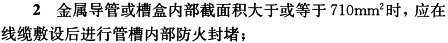 1.10.2條文第2款中要求當(dāng)導(dǎo)管和槽盒內(nèi)部截面積大于等于710mm2時(shí),應(yīng)從內(nèi)部封堵。較大規(guī)格的電纜槽盒的內(nèi)部封堵在工程實(shí)踐中執(zhí)行較好,需特別注意的是,部分內(nèi)部截面積已達(dá)到需要封堵程度的小規(guī)格電纜槽盒在工程實(shí)踐中未實(shí)施封堵的情況比較普遍。根據(jù)該規(guī)定并結(jié)合所查閱的相關(guān)數(shù)據(jù)(國(guó)標(biāo)圖集19DX101-1中的P6-42~P6-44頁(yè)等),可推導(dǎo)出規(guī)格為SC32、JDG40、PC40、